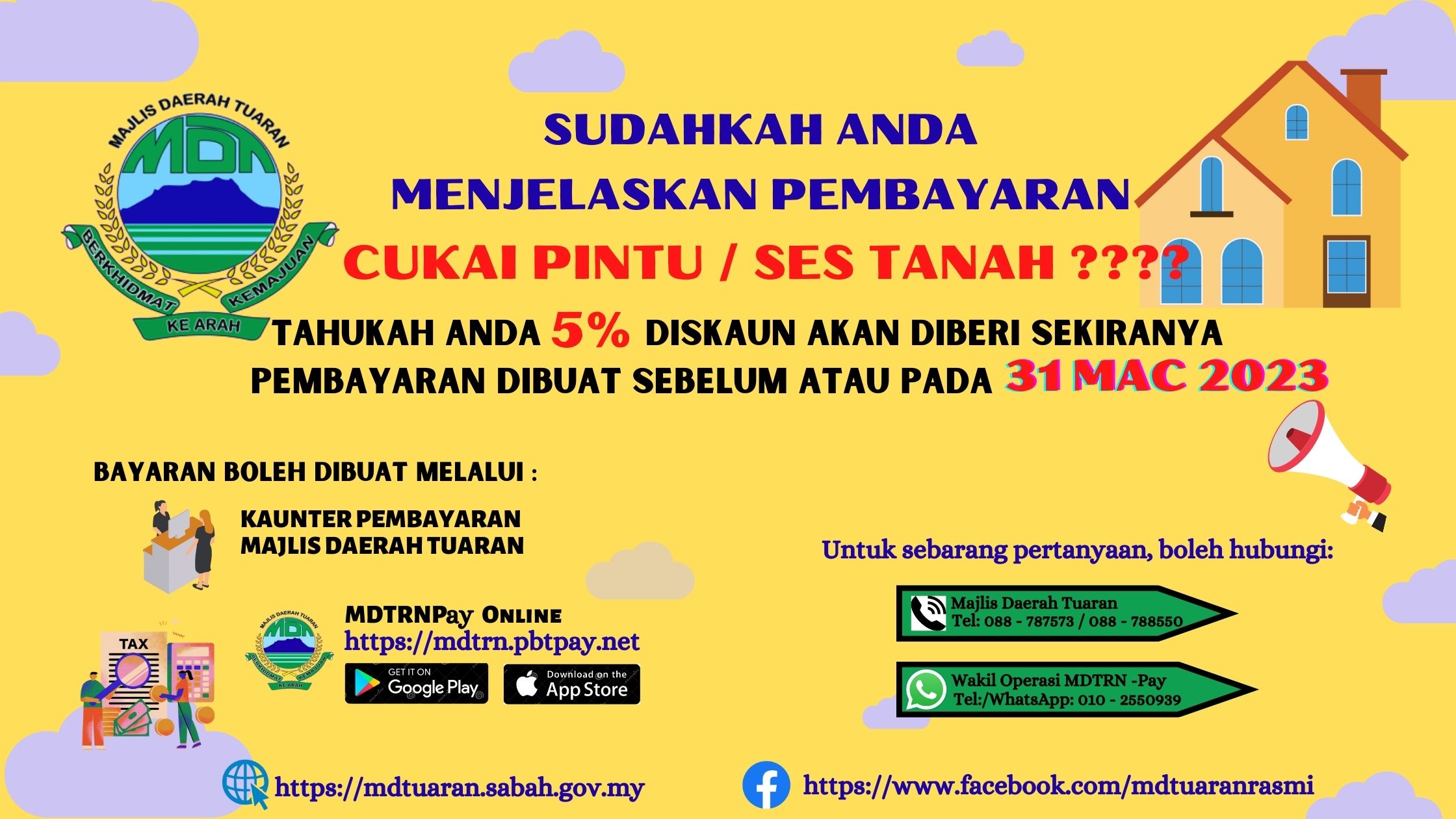 PEMBAYARAN CUKAI PINTU / SES TANAH5% Diskaun akan diberikan sekiranya pembayaran dibuat sebelum atau pada 31 Mac 2023